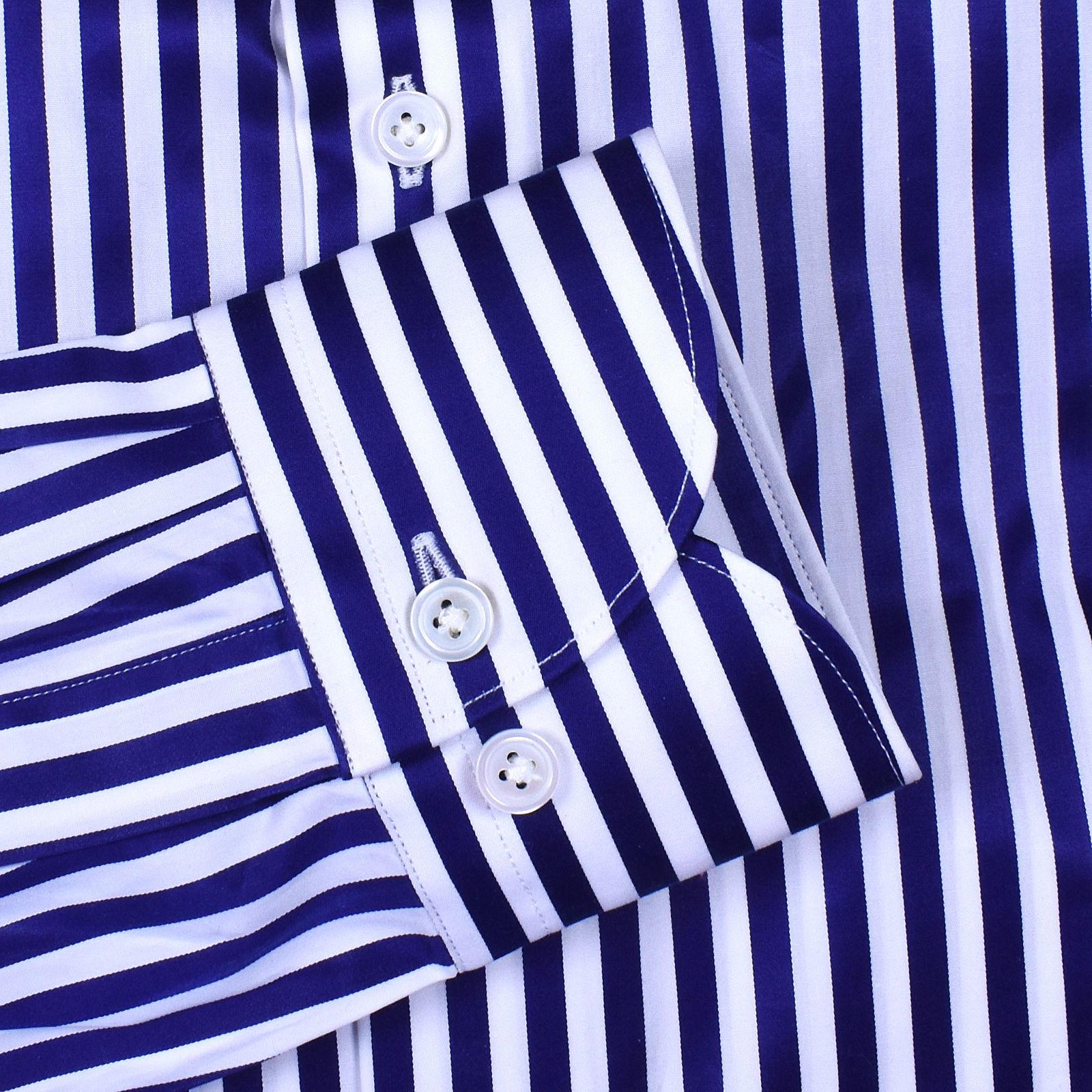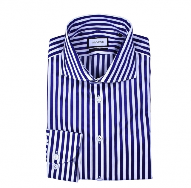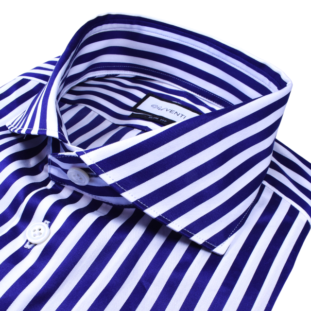 Stylowa i uniwersalna koszula uszyta z wysokiej jakości tkaniny w klasyczny niebieski pasek bengalski. Smukły krój typu slim fit podkreśla sylwetkę, zapewniając elegancki wygląd. Kołnierzyk cutaway (szeroko rozstawiony) dodaje nowoczesnego charakteru i doskonale prezentuje się zarówno solo, jak i z krawatem czy muchą.